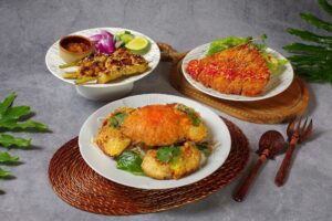 – 主廚精選主餐三選一,包括泰式燒烤沙嗲串、黃金鑲蟹堡及泰風炸豬排