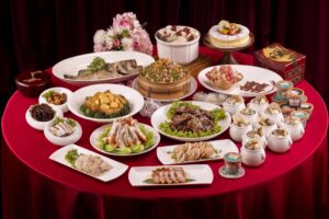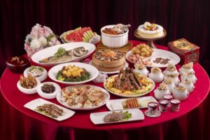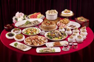宴會菜色由星級主廚團隊精心獻藝,每道佳餚皆以上乘食材與精湛手藝呈現祝福寓意。婚宴精選佳餚包括迎賓六品集,包含胡麻帆立貝、蜜汁叉燒、嫩油雞、脆鱔、和風軟絲及黑糖栗子,象徵六六大順與喜氣開席。菜膽北菇燉翅盅,嚴選花膠雞湯為底,搭配鮮嫩菜膽與厚實北菇,細火燉煮魚翅盅,湯色金潤澄亮、滋味鮮醇濃郁。蠔黃鮑魚燴烏參,嚴選頂級鮑魚與烏參,以主廚特製蠔皇醬慢火燴煮,鮮香濃潤、膠質豐盈,展現極致海味奢饗。
