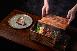延續直火主軸,直火炭烤料理選用日本A5和牛鯉魚管與北海道干貝,經備長炭炙燒後,由主廚以木盒煙燻形式進行桌邊演繹,融合香草與香料釋放層層遞進的煙燻氣息,於開盒瞬間營造視覺與嗅覺交織的沉浸式體驗。主餐「極致牛排饗宴拼盤」則匯聚乾式與濕式熟成工藝,嚴選乾式熟成28天美國CAB肋眼心與濕式熟成30天美國Prime去骨牛小排,透過龍眼木與紅木直火柴燒,使溫潤果木煙香細緻滲入肉質,在焦香外層與柔嫩內裡之間取得平衡,進一步堆疊出深邃且富層次的風味表現。