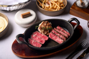 PRIME ONE牛排館以「直火、熟成、精緻」為料理核心,嚴選龍眼木進行柴燒,其燃燒穩定且帶有溫潤果木香氣,能於高溫炭火中賦予食材細緻煙燻風味,同時保留肉質本身的層次與甘甜。透過精準掌握火候與烹調節奏,使食材外層形成誘人焦香,內裡維持柔嫩多汁,完整展現熟成工藝所帶來的風味深度與平衡表現。