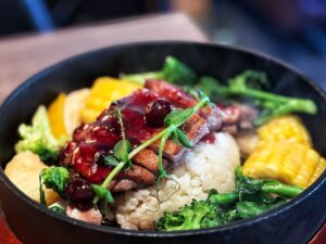 母親節六人分享餐道道經典,除了同樣可任選三道下酒小菜,任選兩種口味的雙拼風味披薩及義式香料紙包烤魚外,更包含「炙燒松阪豬女婿蛋沙拉」炙燒後的松阪豬香氣四溢、肉質彈牙,搭配滑嫩女婿蛋與清爽生菜,咀嚼間香氣在舌尖綻放;「沙嗲雞肉大串串」烤至表面微焦的雞肉搭配主廚特調沙嗲醬,份量十足的串燒每份有三串,是不容錯過的星馬經典街頭美食;「炸物拼盤」匯聚酥炸魚皮、香脆薯條、洋蔥圈、德式香腸以及坦督烤棒腿,金黃香酥的炸物搭配四款特色沾醬也是聚會熱門必點;「炙燒櫻桃鴨胸飯」將鴨胸烤至外層微脆肉質柔嫩多汁,佐以酸甜野莓醬提味,口感與香氣十足,令人回味無窮;而氣勢十足的「大力金剛腿」以外皮香酥、肉質軟嫩的厚實豬腳豪邁登場,口感濃郁層次豐富,風味迷人;「炙燒鮭魚火山卷」將炙燒過的鮭魚片覆蓋壽司醋飯上,食玩翻轉的火山卷兼具視覺與味覺的雙重饗宴,一直是餐廳的招牌料理。