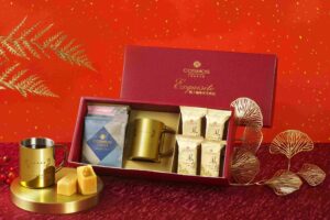 禮盒主打飯店超人氣鳳梨酥,清香的鳳梨酥選用台南關廟鳳梨,依黃金比例製作,鬆軟餅皮搭配甘美內餡,豐富纖維食感每口散發濃郁果香。另含飯店自有品牌「拾柒Café」自烘濾掛咖啡,包含:散發柳橙莓果、蜂蜜香氣且甜感悠長的淺焙藝妓,與帶有莓果、花香、焦糖風味的中深焙綜合配方豆,濾掛沖泡輕鬆享有香醇馥郁的咖啡,同時包含食品級304不鏽鋼馬克杯,以純粹的金屬元素融合時尚展現簡約,外層的鍍金與雷刻顯露光影的層次推疊,是款可以展現個人品味的造型杯具,也為年節贈禮帶來新選擇。