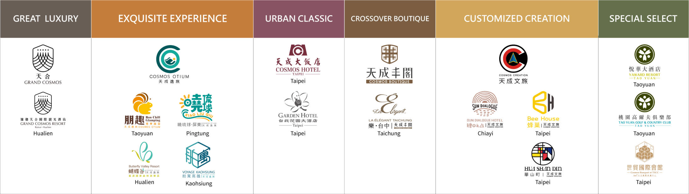 The Cosmos Hotels & Resorts has evolved from self-constructed and self-owned hotel properties to establishing a brand and building up professional management expertise, transforming into a comprehensive and well-rounded hotel management group. Cosmos Hotels & Resorts comprises four major business entities: hospitality businesses, off-site F&B, golf course, and real estate development. Each entity upholds core values of “diversity, unity, community and sustainability” and a service ethos of thoughtfulness and warmth encapsulated in the motto “Thoughtful in Every Detail, Warmth in your Heart.” These values and spirit are aimed at meeting the diverse needs of customers at all levels, and they are dedicated to providing consumers with meticulous service and profoundly wonderful experiences.